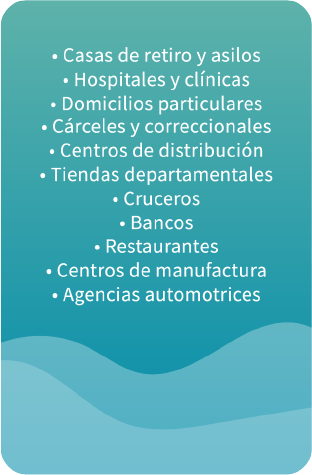 Soluciones patentadas de mayor eficacia frente a una amplia gama de virus, bacterias, parásitos y metales. Abordaje, aplicaciones de punto de uso en fuentes de agua, dispensadores, máquinas de hielo, desinfección, protección con cortafuegos y puntos de entrada en una instalación.